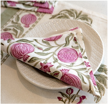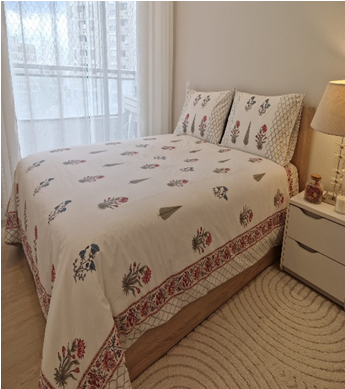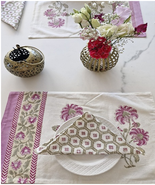 C'est une technique ancestrale du Rajasthan d'impression manuelle qui consiste à sculpter des motifs sur des blocs de bois, trempés dans des couleurs végétales puis appliqués sur des tissus déployés sur des tables infinies et qui donnent de magnifiques imprimés colorés faits à la main : Une trace du geste, du temps et de l'âme humaine dans chaque motif
