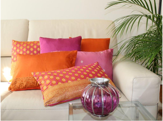 J'ai commencé par créer des coussins pour mon salon, puis pour mes proches en sélectionnant avec soin une collection de saris et confié leur transformation à des artisans locaux à Bombay, en veillant à la qualité de chaque finition, à l'unicité de chaque pièce.